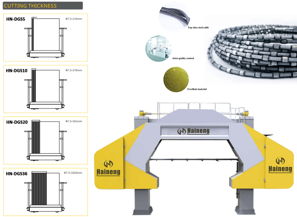 Cette machine utilise plusieurs fils diamantés pour découper des blocs de granit. Ces fils, d'un diamètre de 6,3 à 7,3 mm, sont recouverts de billes de diamant enfilées. Chaque mètre de fil contient 37 billes. Ces billes, agissant comme abrasifs, permettent de réaliser la découpe sous l'action refroidie et nettoyante d'un flux d'eau, qui évacue les résidus.